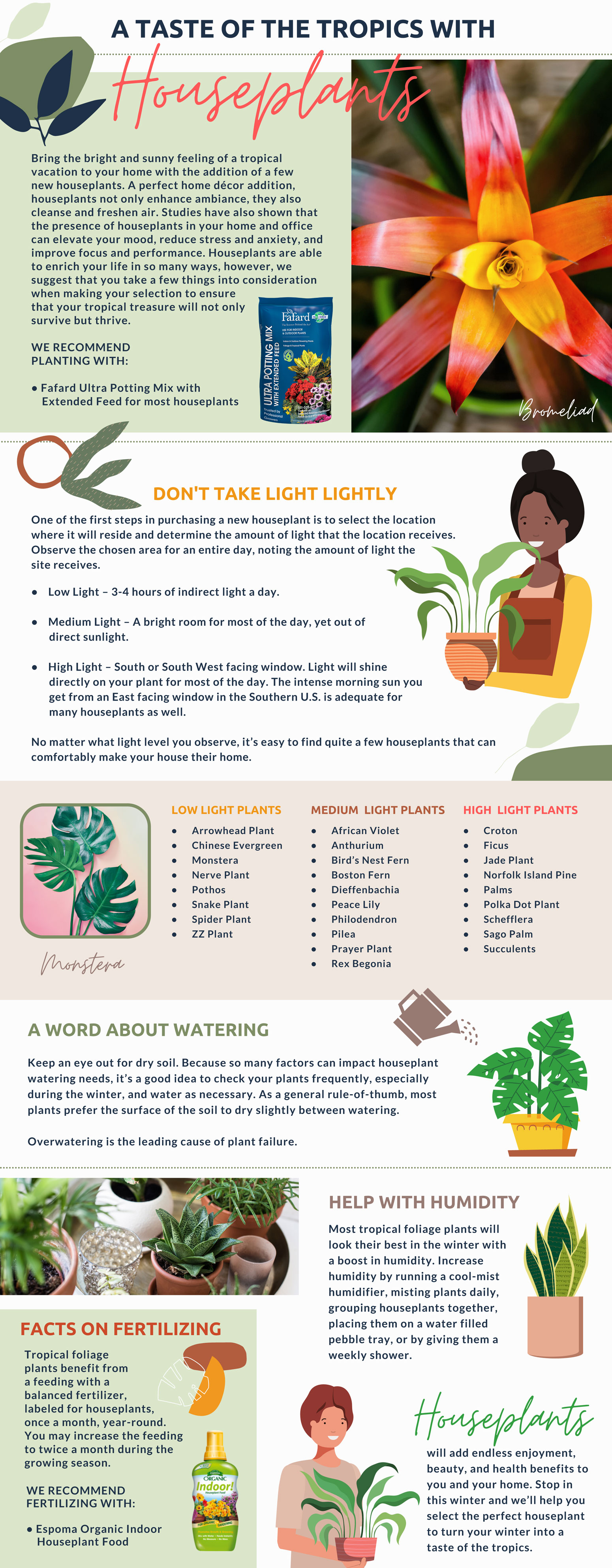 Bring the bright and sunny feeling of a tropical vacation to your home with the addition of a few new houseplants. A perfect home décor addition, houseplants not only enhance ambiance, they also cleanse and freshen air. Studies have also shown that the presence of houseplants in your home and office can elevate your mood, reduce stress and anxiety, and improve focus and performance. Houseplants are able to enrich your life in so many ways, however, we suggest that you take a few things into consideration when making your selection to ensure that your tropical treasure will not only survive but thrive.