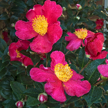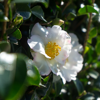 Camellia, Japonica & Sasanqua: Evergreen, shiny foliage, great for areas that receive morning sun, afternoon shade, (Sasanqua varieties can take more sun). Many grow 8-10 ft. tall, however, smaller varieties are available. Sasanquas bloom in fall; Japonicas bloom December to March.
