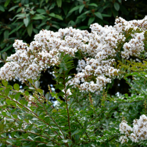 Natchez Crape Myrtle: This lovely southern tree accents the landscape with a weeping growth habit, full of elongated white blooms in summer. Deciduous (drops leaves in winter), sun-loving and fast-growing, it will reach 20 ft. in height. Don’t prune, unless you need to shape it a bit; let it grow naturally to its mature size.