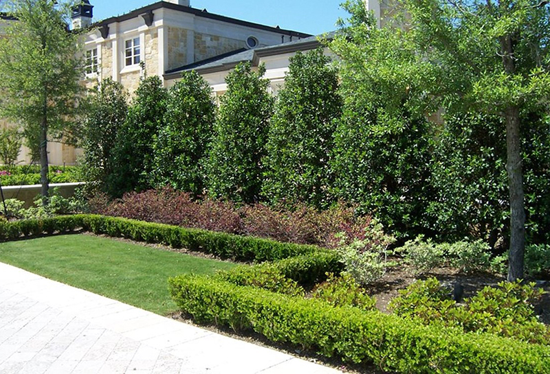 While 8-10 ft. is an average height for most privacy screening, 12-18 ft. or even higher (30-40 ft.) is attainable with several varieties and may be appropriate depending on the landscape. In a subdivision with ¼ acre lots, it’s unlikely that 30-foot Carolina Sapphire can be installed along the property line, however, it would work beautifully on a larger lot on the lake or in a more rural area. Note: A trick to raise the elevation of your plant screen is to build up the soil or “berm” the planting area. In areas of dense clay, this will also improve the ability of plants to establish a good root system.